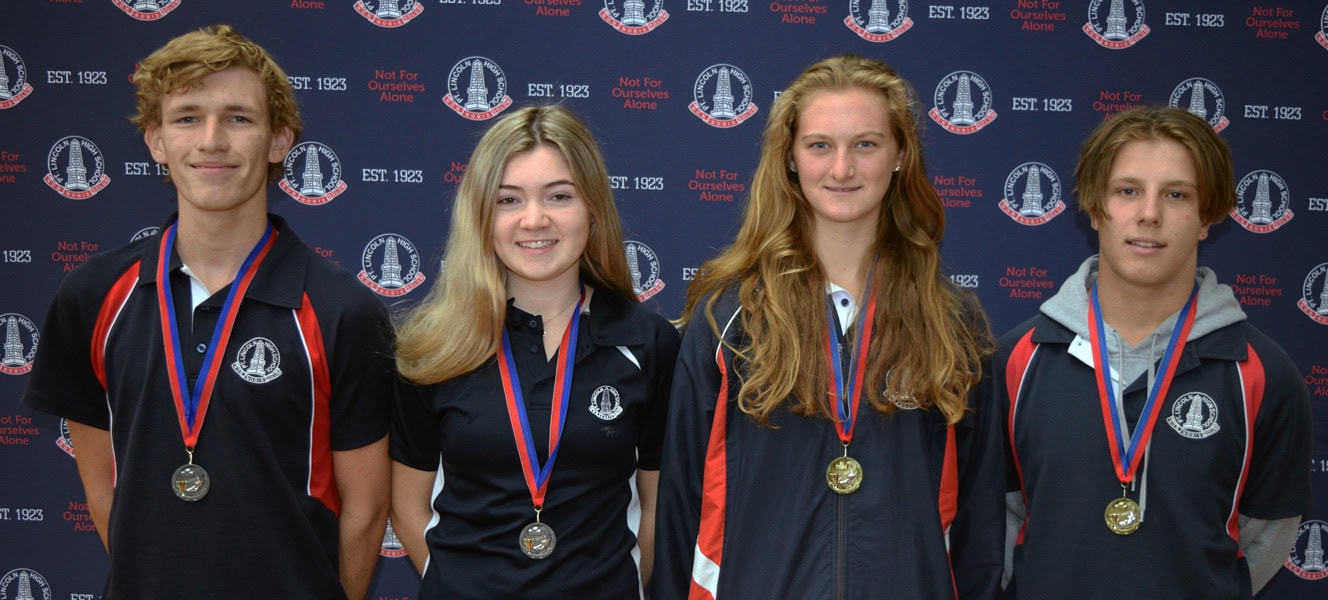 Open Age Group Champions (L-R): Open Boys Runner-up: Jackson Jamieson (Eyre house / 31 points), Open Girls Runner-up: Kellie Lessue (Grantham house / 47 points), Open Girls Winner: Ella Stevens (Eyre house / 60 points) & Open Boys Winner: Max Rogalski (Grantham house / 46 points)