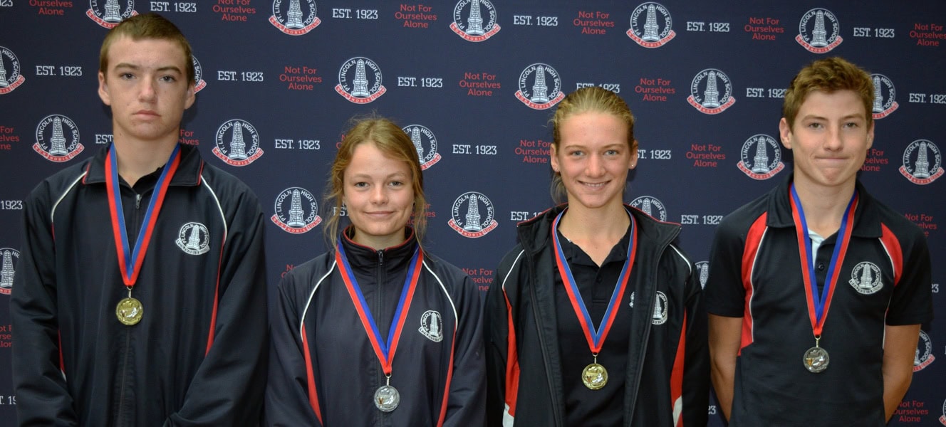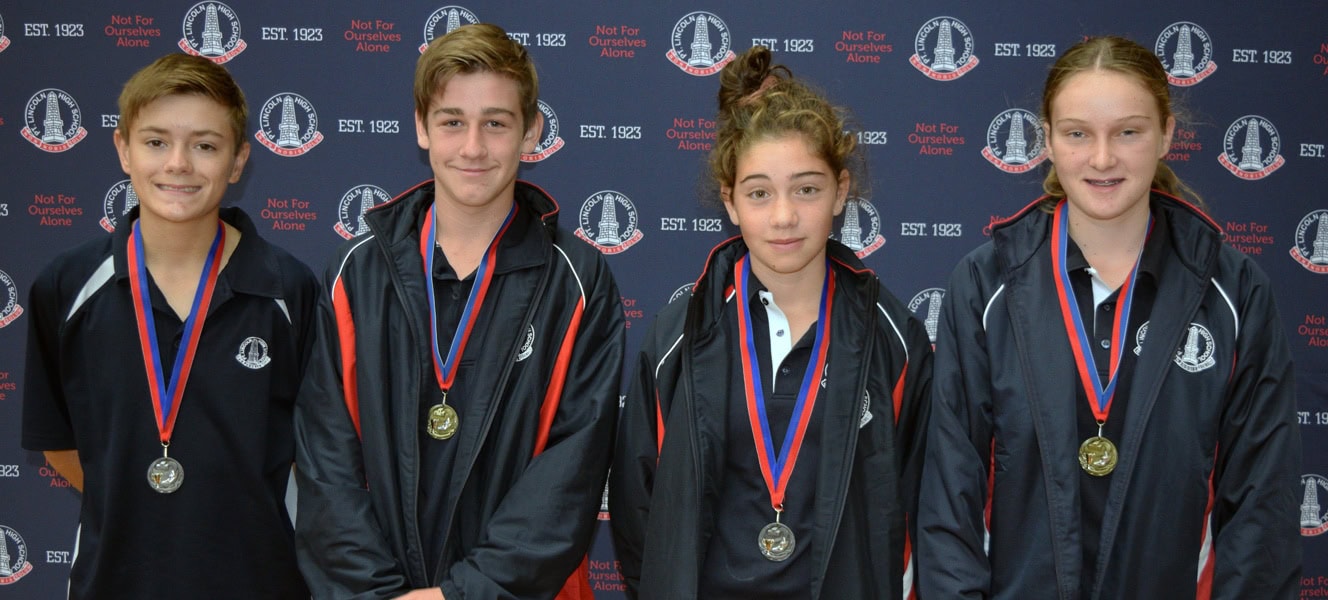 Under 14 Age Group Champions (L-R): Under 14 Boys Runner-up: Luke Pearce (Flinders house / 42 points), Under 14 Boys Winner: Jake Sherry (Eyre house / 47 points), Under 14 Girls Runner-up: Tayah Liffner (Eyre house / 35 points) & Under 14 Girls Winner: Keely Wiseman (Flinders house / 36 points),