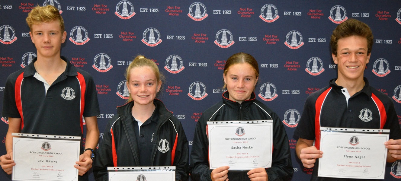 2020 Year 8 Student Representative Council Members (L-R): Levi Hawke, Amy Ward, Sasha Noske & Flynn Nagel
