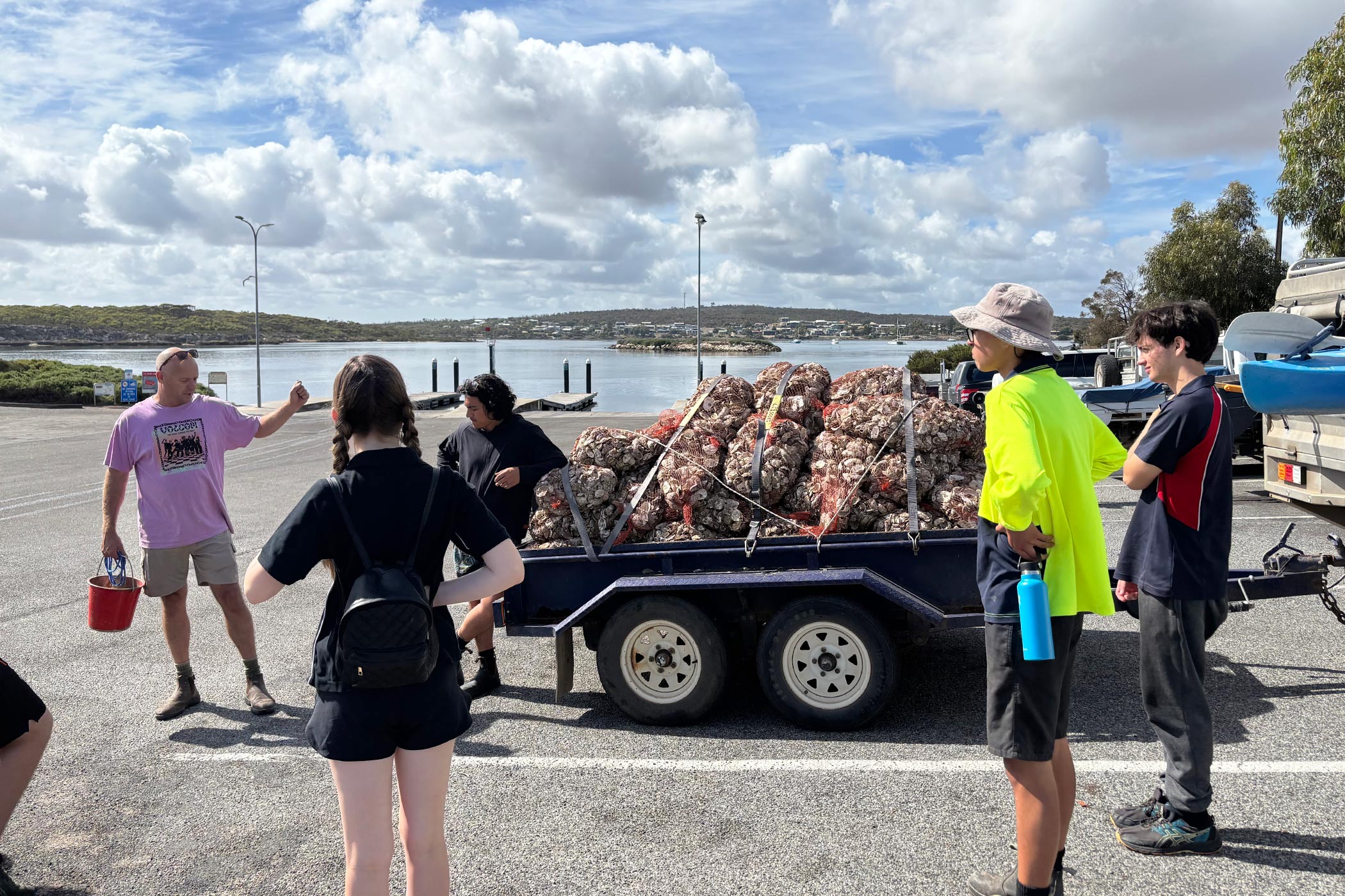 Thanks to Matt Waller from Cuttys, our students participated in extending the reef system using discarded shells from local oyster farms. Our crew made over 200 bags and dropped them into Coffin Bay near Goat Island.