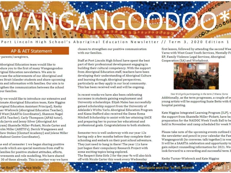 We acknowledge the Barngarla people as the traditional custodians of the land that we teach and learn on. We pay our respects to their Elders – past, present and emerging – and value the Barngarla people’s culture, identity and connection to country, waters, family and community.