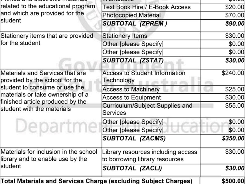 PLHS Material and Services Charge for 2025