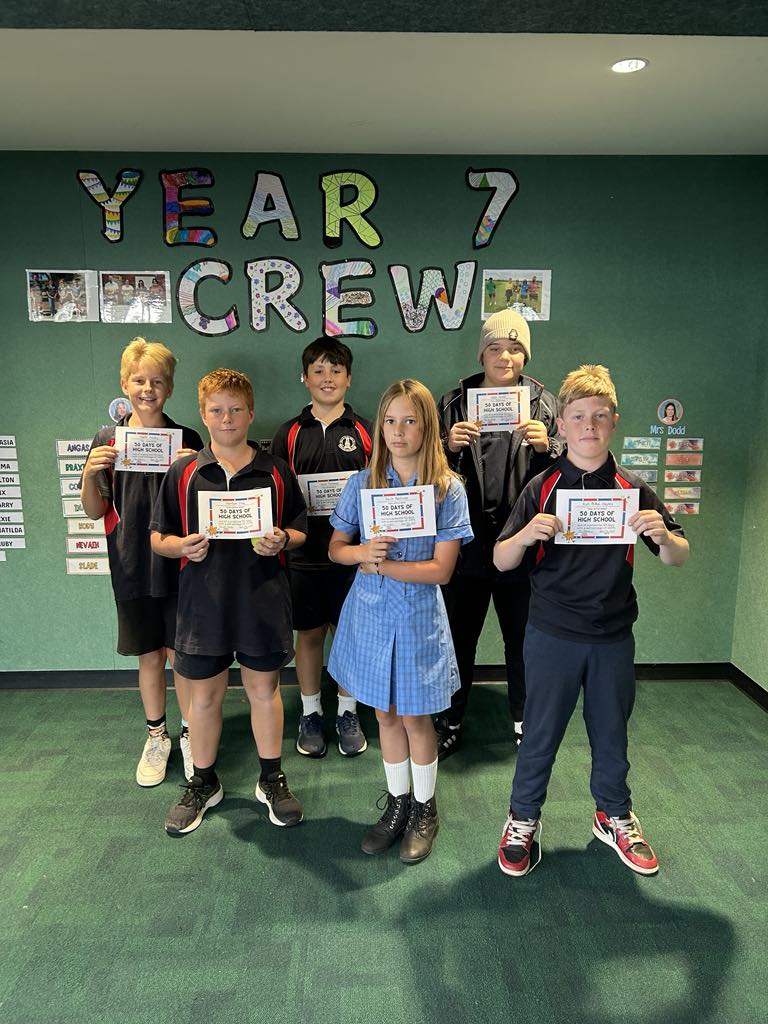 Pictured here are (L-R) Charlie Densley, Harrison Gray, Connor Thompson, Darcie Manthorpe, Osten Thorpe and Kurt McNab-Haynes who have attended all fifty days.