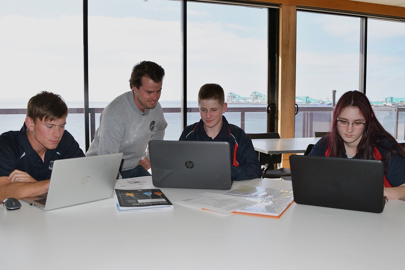 Above: Year 11 students (L-R) Cody Rawling, Blake Simes and Natalie Castle receiving support with their individual Research Projects from teacher Mr Angus Martin (second from left).