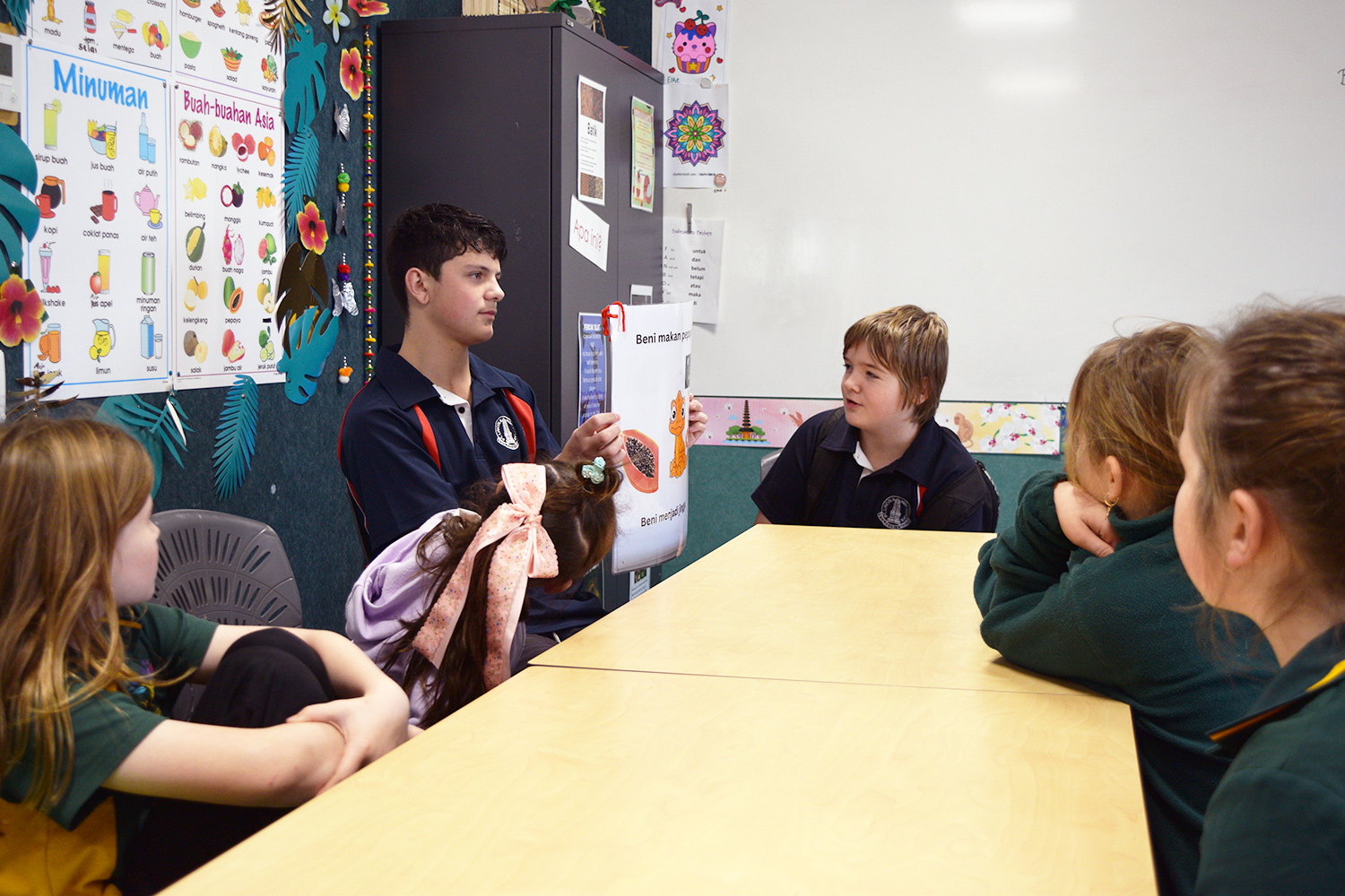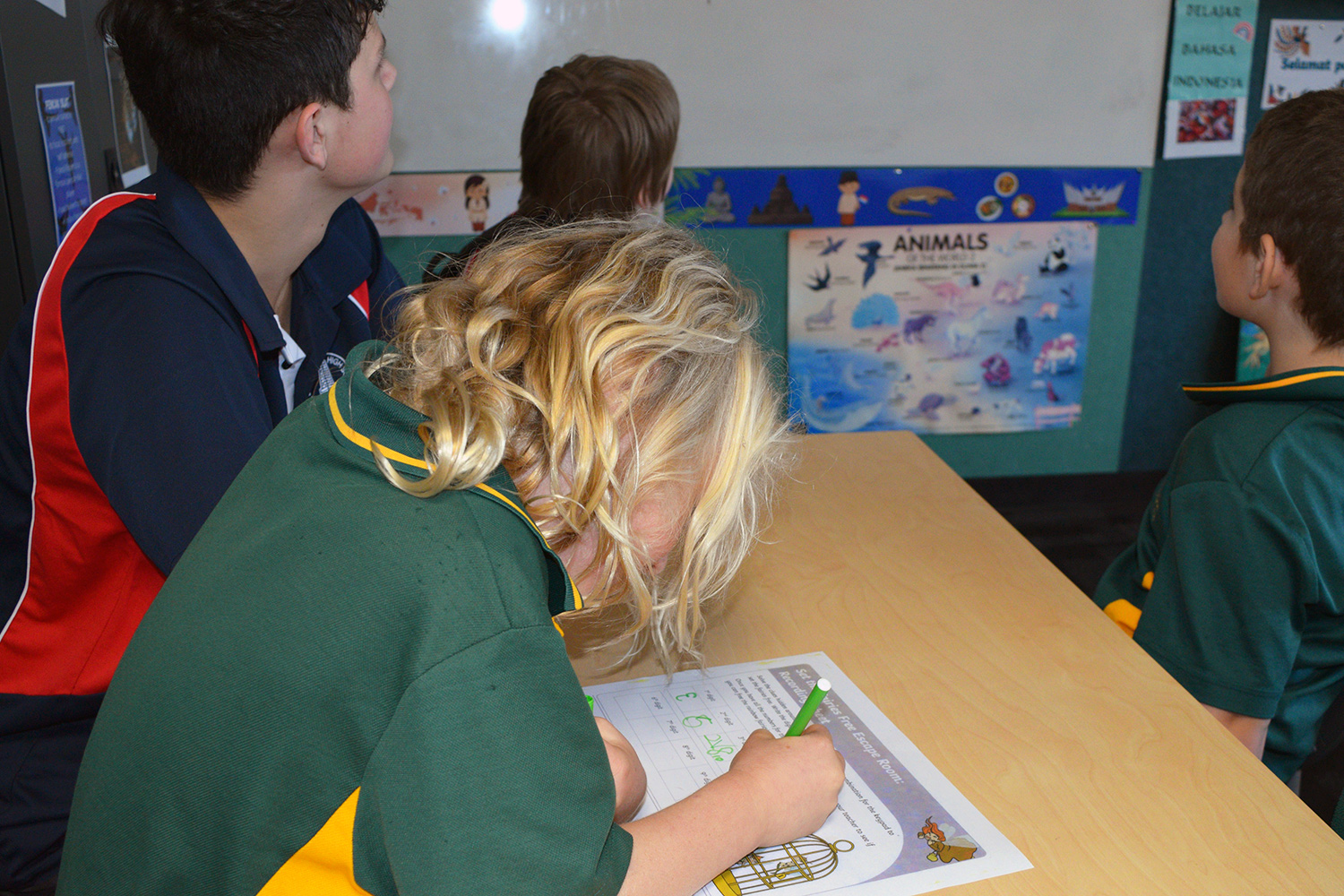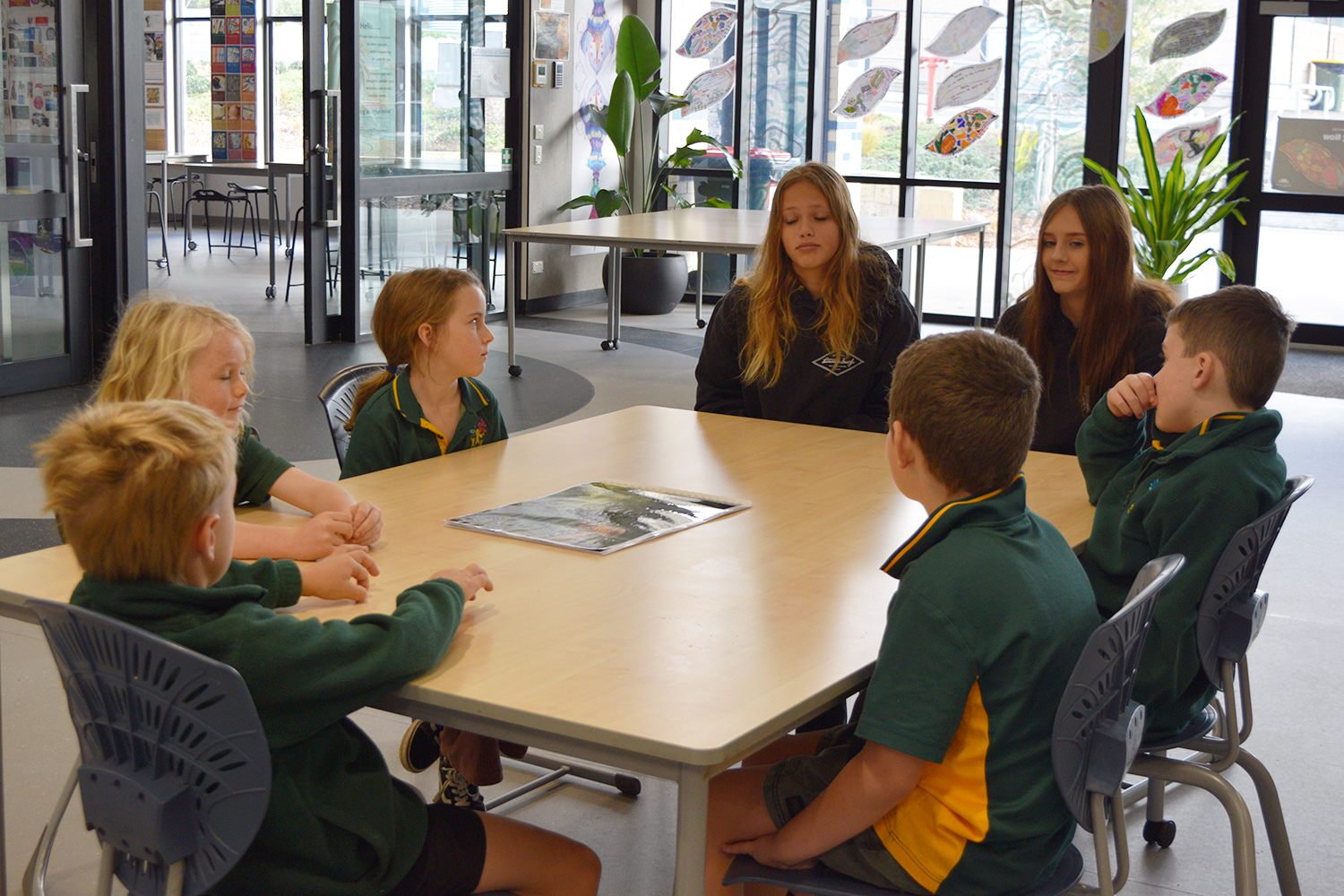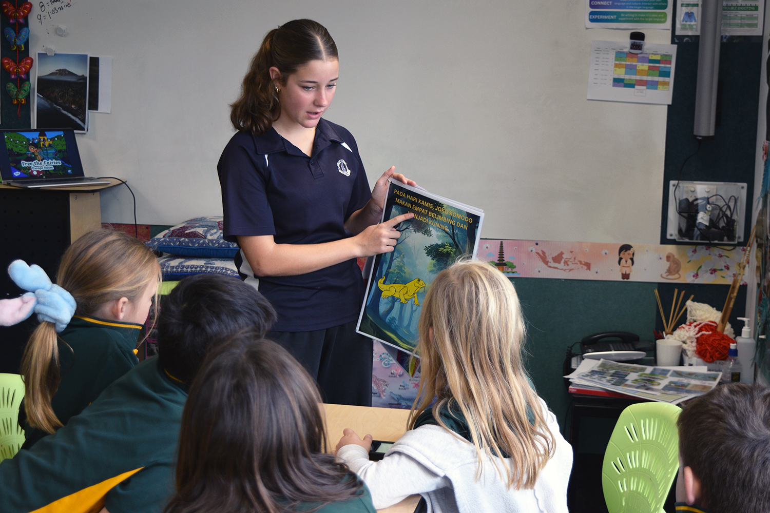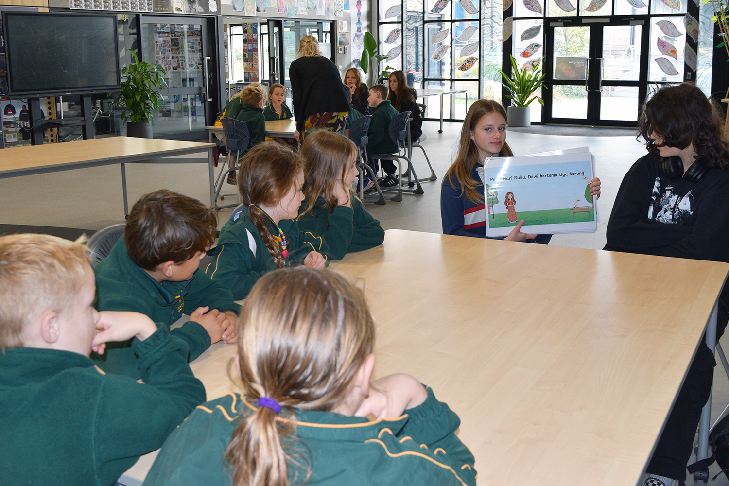 Earlier today, Bu Portia Veldhuyzen and her Year 2 class from the Port Lincoln Junior Primary School visited our Indo classroom. During their visit, the following Year 9’s – Sienna Sizer, Lily Hale, Chelle Clark, Gracie Fraser, Melika Goldsmith-Doudle, Tyler Cowley and Ryley Gilchrist – read their books to small groups of Year 2 students and received some very constructive feedback and comments.