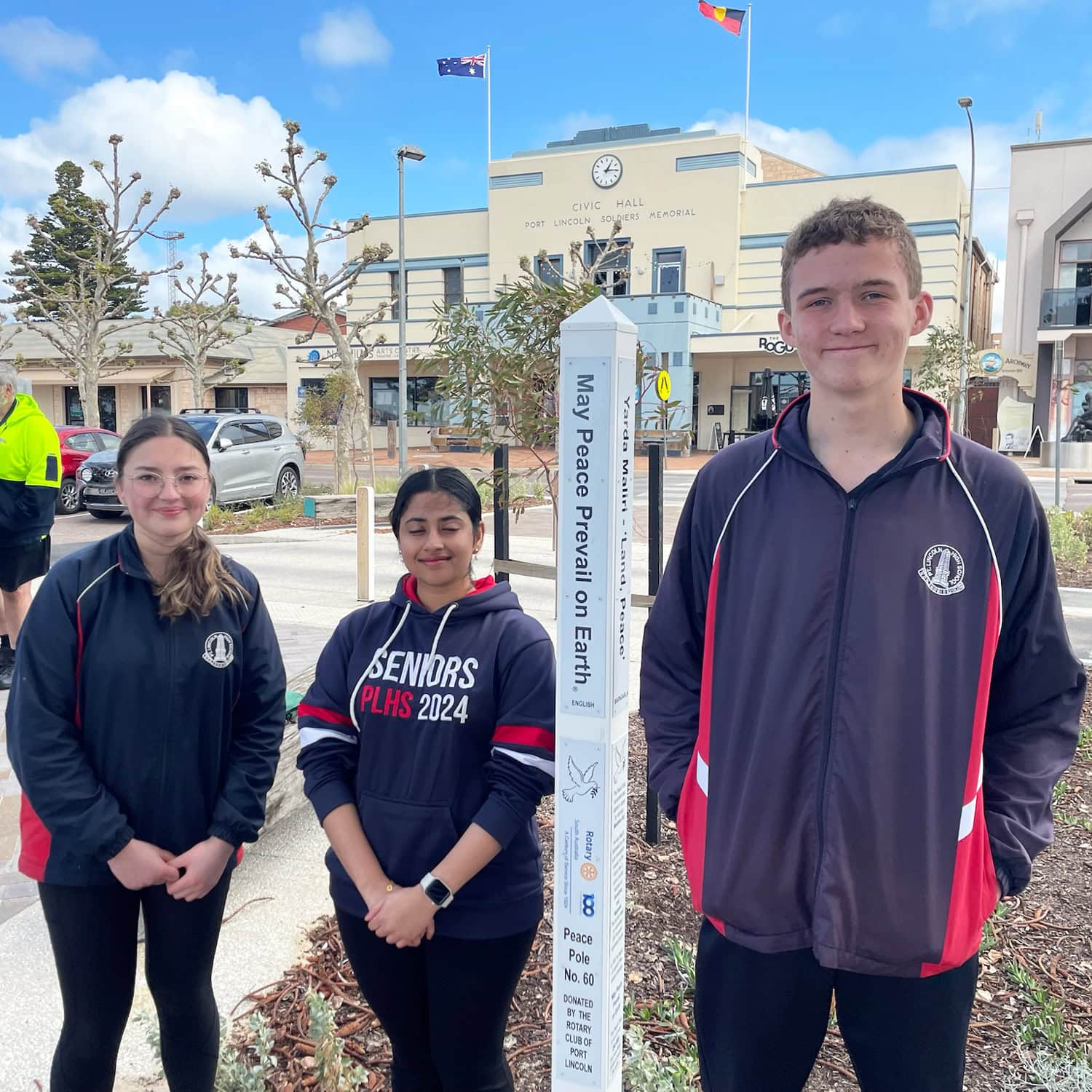 Last Friday, three PLHS students – Prapti Pai, Sophie Lang and Rhy Kayser – assisted in the unveiling of a second Rotary Peace Pole within the City of Port Lincoln; the first is located in Puckridge Park. On this occasion, the ceremony was conducted on the foreshore (near the start of the Town Jetty) by student representatives from all three high schools, Mayor Diana Mislov and Rotary Club of Port Lincoln Youth Director, Robyn Rowsell.
