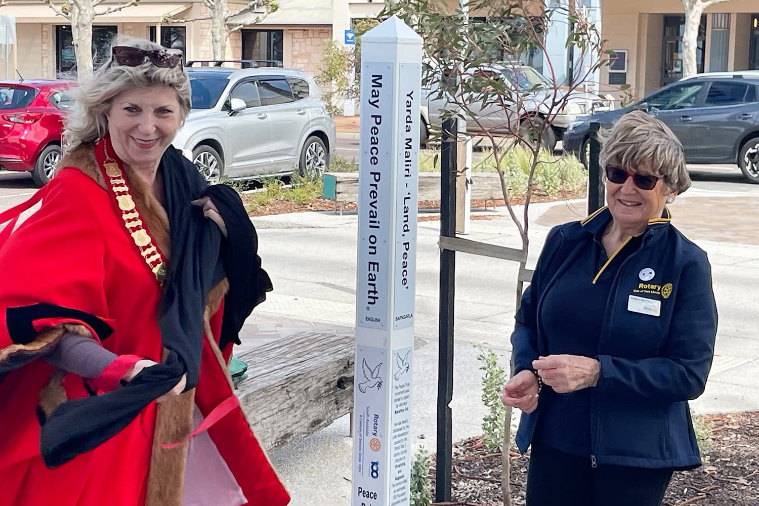 Standing proudly in the recently developed Port Lincoln Foreshore Precinct, the new Peace Pole declares “May Peace Prevail on Earth” in four languages – English, Barngarla, Croatian and Japanese. During Friday’s ceremony, Prapti delivered the accompanying proclamation in English, Rhy in Japanese and Sophie in French.