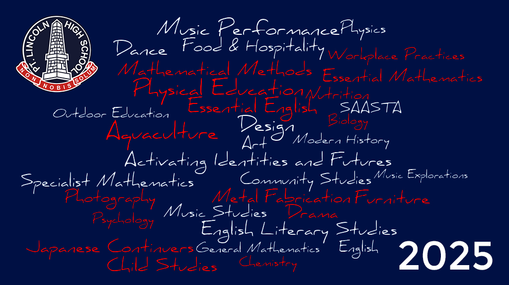 As the largest secondary school on the Eyre Peninsula, Port Lincoln High School is proud to offer a wide assortment of curriculum offerings to our students each year. We are particularly delighted to announce that in 2025, we are able to staff and deliver 34 SACE Stage 2 subjects to our Year 12 cohort.