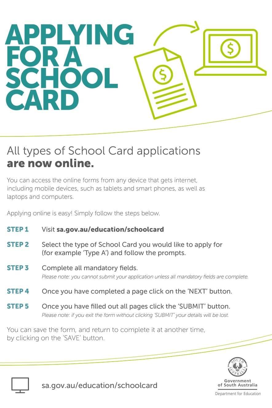 If you are yet to pay your school fees and think you may be eligible for Government School Card Assistance, you will need to apply at the school or online at: www.sa.gov.au under Education, Skills and learning: 2020 School Card Assistance before Friday.