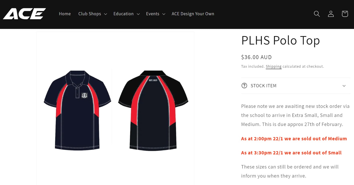 Our school uniform provider (ACE Merch & Apparel) has advised that they are out of stock of our small and medium polo shirts until late February.