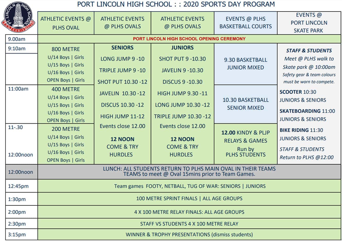 We are looking forward to seeing all students at our 2020 SportsDay tomorrow, located at the PLHS ovals/courts (plus Port Lincoln Skate Park).