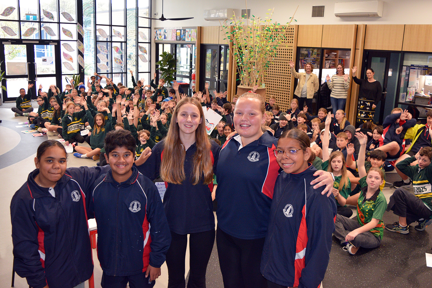 Well done also to the twenty Year 8 students who volunteered to support our staff in facilitating today’s activities; a special mention must go to (pictured below L-R) Skyla Long, Dhanura Madiarachchige, Neve Thomas, Frankie Woolford and Mavis Coleman, who delivered welcome and farewell messages to the Year 6’s in Barngarla, Indonesian and Japanese language.