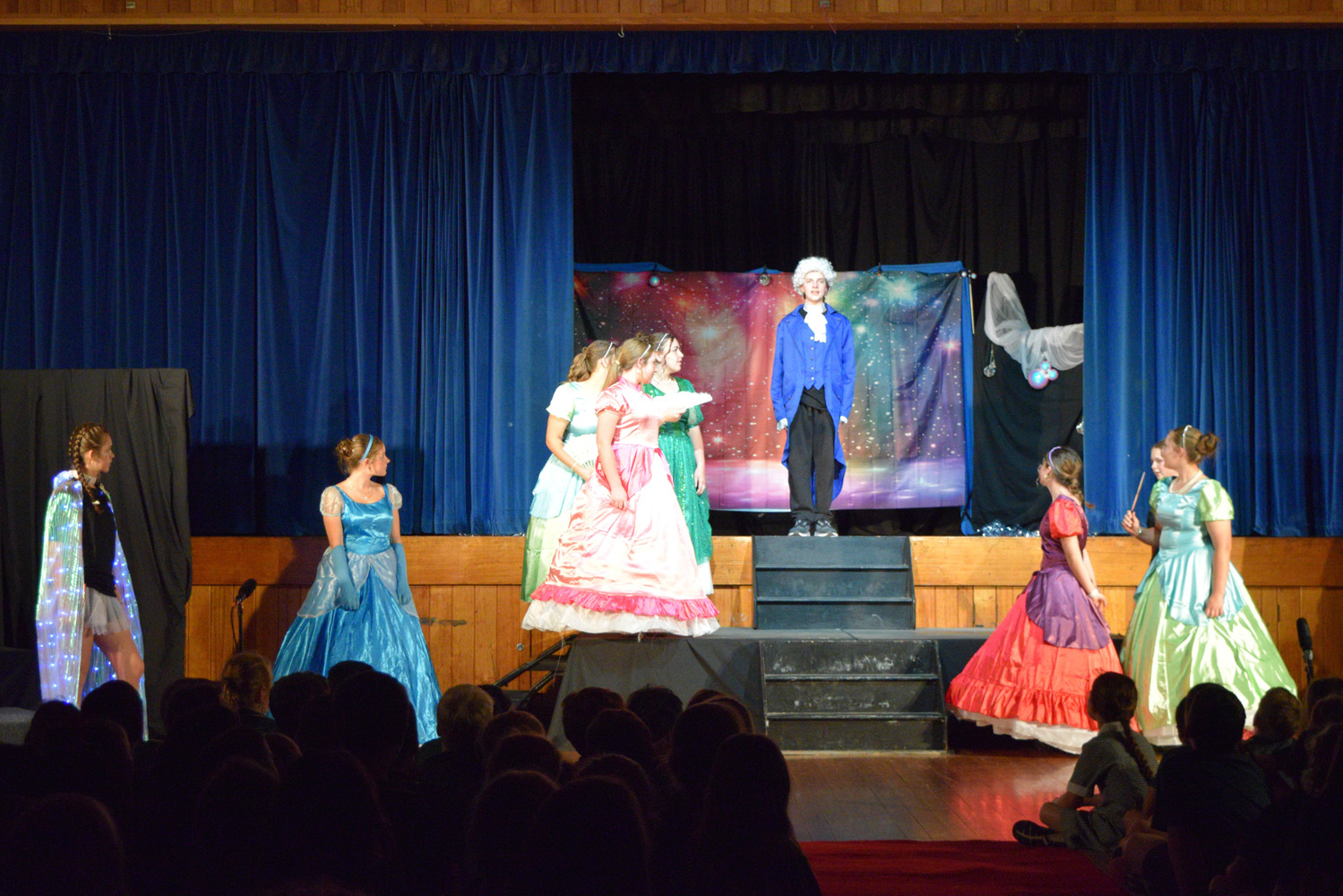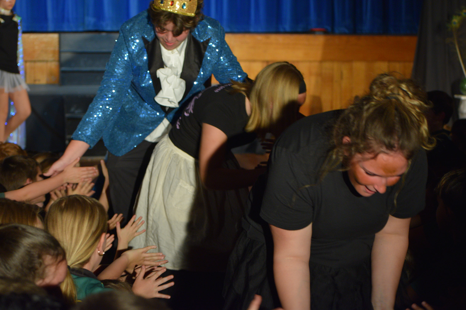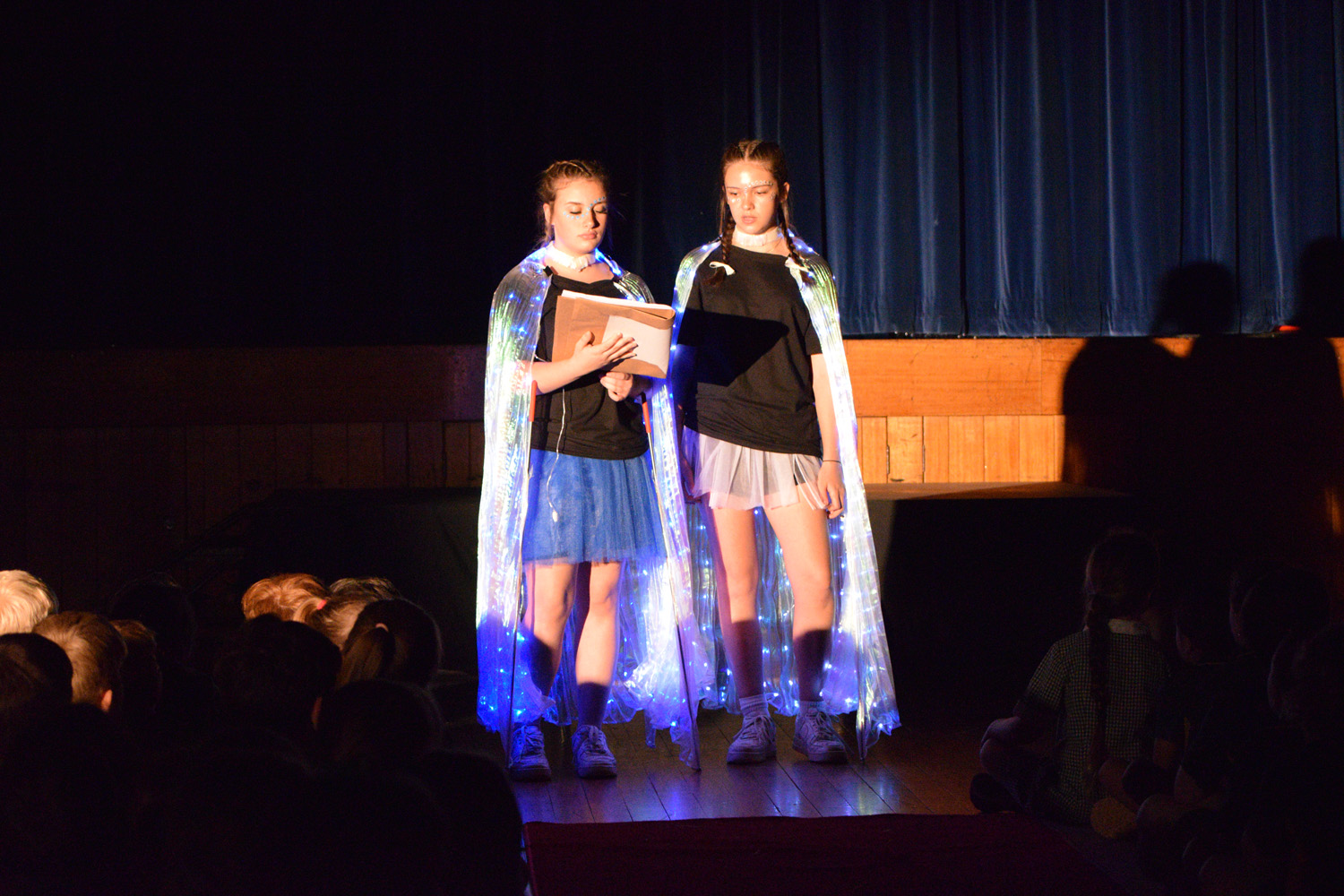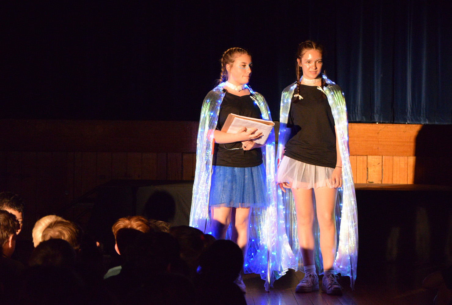 Fortunately, our small class of Year 9 Drama students was able to access the Hall for their nine performances, despite the renovations happening in this space. With the assistance of Stephen Campbell and a merry band of Year 10 students, temporary lighting and sound was created to illuminate the stages and produce the theatrical magic expected from a PLHS Panto.