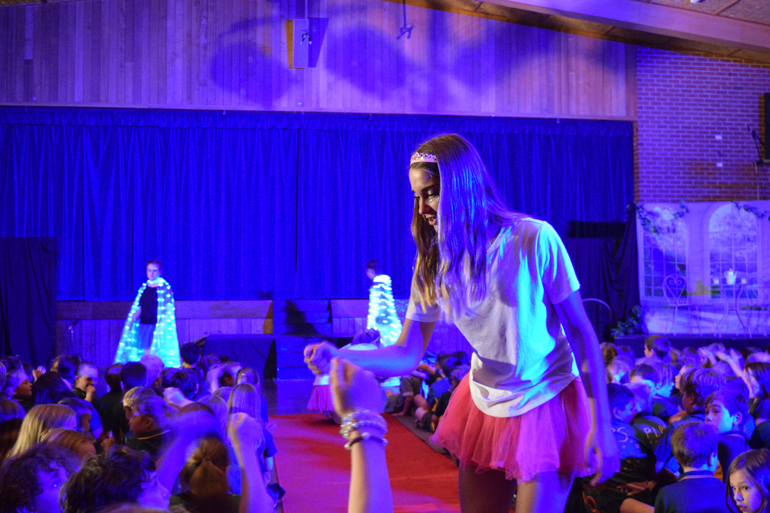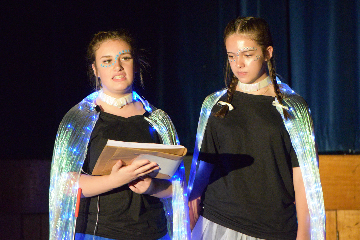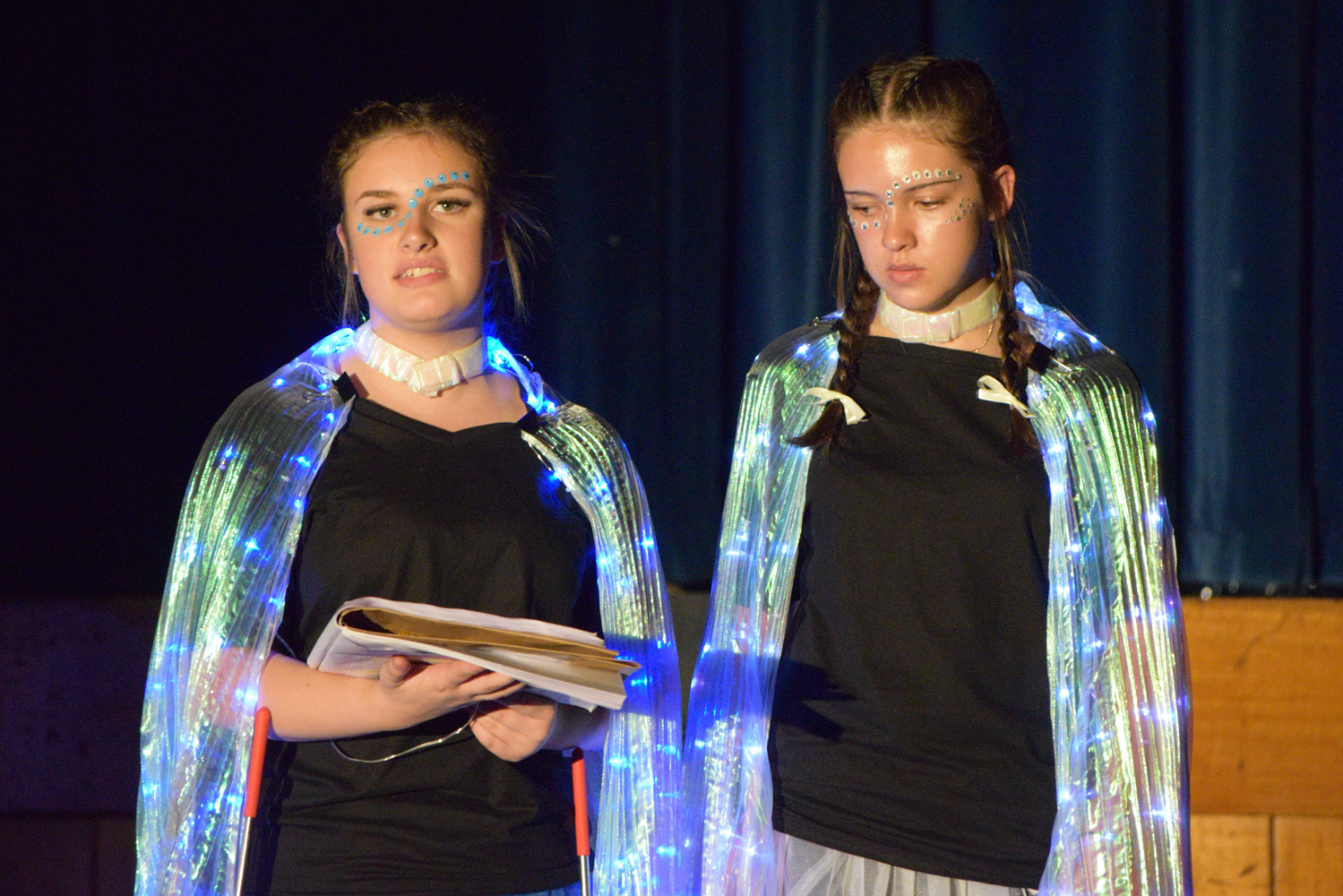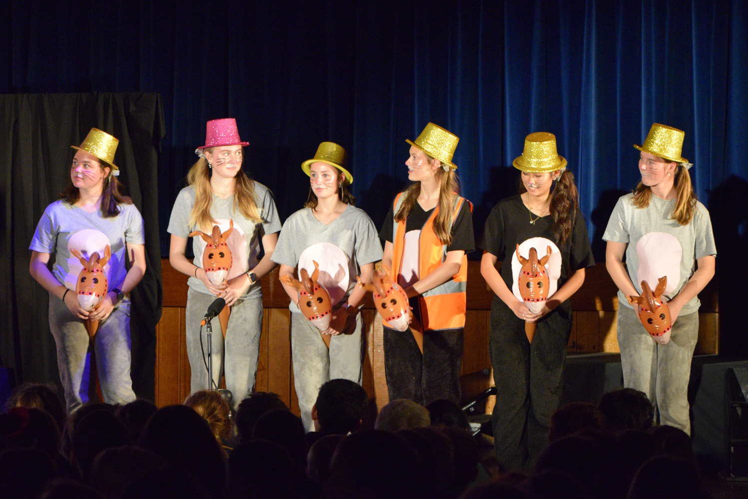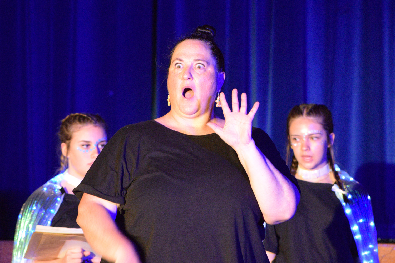 Fortunately, our small class of Year 9 Drama students was able to access the Hall for their nine performances, despite the renovations happening in this space. With the assistance of Stephen Campbell and a merry band of Year 10 students, temporary lighting and sound was created to illuminate the stages and produce the theatrical magic expected from a PLHS Panto.